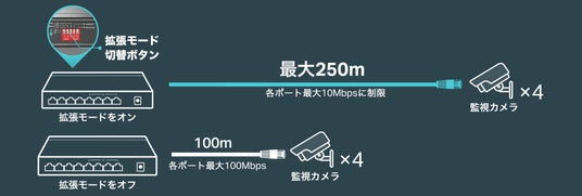 拡張(Extend)モードを使用すると、PoEお伝送距離が最大250mに。広範囲にわたる監視カメラの設置が可能なります。(※拡張(Extend)モードでは通信速度は最大10Mbpsに制限されます。実際の最大通信可能距離はPoEデバイスの消費電力やケーブルの品質に左右されます。)