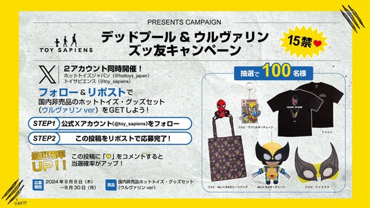 ホットトイズジャパンの公式X(@hottoys_japan)とトイサピエンスの公式X(@toy_sapiens)では、それぞれ抽選で100名様に国内非売品のホットトイズ・グッズセットが当たるSNSキャンペーンを2アカウント同時開催中!各アカウントをフォロー&リポストすることで、ホットトイズジャパン公式Xではデッドプールver.、トイサピエンス公式Xではウルヴァリンver.のグッズセットに応募できます。該当ポストに「(ハート)」の絵文字をコメントすることで当選率がUP。さらにコメント数が多い方のアカウントには、デッドプール(ホットトイズジャパン公式X)もしくはウルヴァリン(トイサピエンス公式X)の「オリジナルショッパー」がプレゼントに追加されます。応募期間は2024年9月30日(月)までです。※注意事項は各応募用のポストをご確認ください