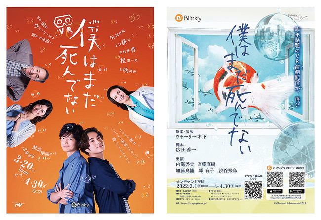 「技術」と「アイディア」をいくつも結びつけ、まだ世の中にない新しいサービスの創出に取り組んでいる株式会社アルファコード(本社:東京都文京区、代表取締役社長 CEO:水野 拓宏 以下、当社)は、株式会社シーエイティプロデュース(本社:東京都渋谷区、代表取締役:江口剛史)が手掛ける“新たな演劇の鑑賞スタイルを提供する”「STAGE GATE(ステージゲート) VRシアター」の最新作、2021年VR演劇『僕はまだ死んでない』/2022年舞台版『僕はまだ死んでない』を超体感XR配信プラットフォーム『Blinky(ブリンキー)』にて2022年3月よりオンデマンド配信します。2月21日(月)より本配信視聴チケットの販売を開始します。