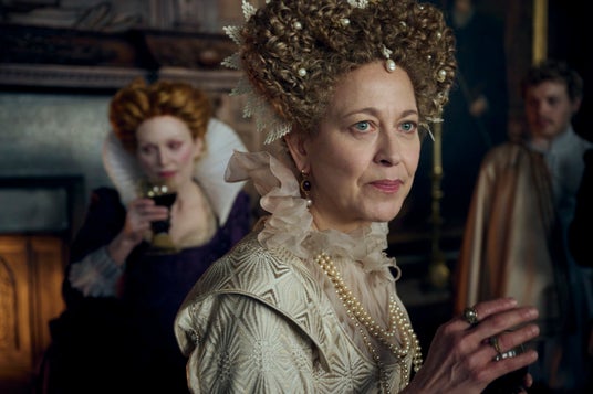 さらに、体を寄せ合うメアリー、ジョージ、ジェームズ1世の姿が描かれたキービジュアルも解禁。魅惑的な瞳でまっすぐにこちらを見つめながら、ジェームズ1世の顔に頬を寄せるジョージと、じっと前を見つめるメアリーの力強い眼差しが印象的なビジュアルとなっている。