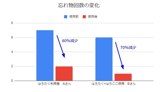 通所訓練の子どもと同様に、「はろたぐ」をつけてから忘れ物の確率が60%ほど減少した。また、「はろここ」を併用した利用者では忘れ物の確率が70%ほど減少した。(グラフ参照)