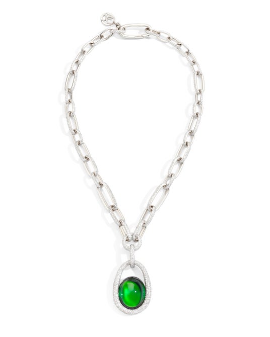 ホワイトゴールドとダイヤモンドのリンクが眩い優雅なプリンセスネックレスの中心にセットすることで、ストーンの持つ美しさを引き出しました。53カラットのオーバルカボションカットのグリーントルマリンと、2,000以上のダイヤモンドが特徴的なピースです。