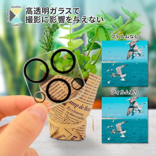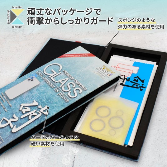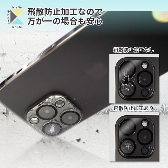 飛散防止加工を行っているので、割れた破片でカメラレンズが傷つくのを防ぎます