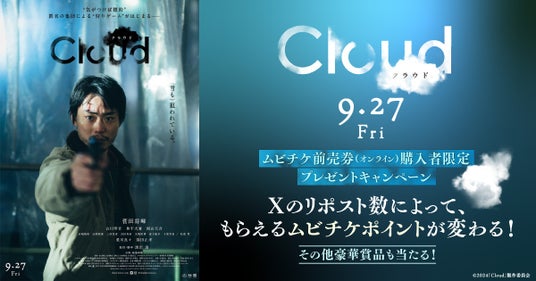 株式会社ムービーウォーカー(本社:東京都千代田区、代表取締役社長:五十嵐淳之)は、映画『Cloud クラウド』のムビチケ前売券(オンライン)の購入者を対象としたプレゼントキャンペーンと、Xのリポスト数によって映画『Cloud クラウド』ムビチケ前売券(オンライン)購入者のムビチケポイント付与数が変化するキャンペーンを同時開催致します。
