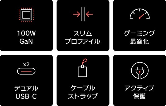 最新の第3世代のGaN(窒化ガリウム)モジュールを採用し、100Wの高出力を実現。従来のシリコン製充電器と比べて、より効率的にデバイスを充電でき、熱の発生も抑えます。
