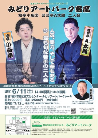 みどりアートパークリニューアルシリーズ みどりアートパーク寄席 「柳亭小痴楽 昔昔亭A太郎二人会」が2022年6月11日 (土)に緑区民文化センター(みどりアートパーク)(神奈川県横浜市)にて上演されます。チケットはカンフェティ(運営:ロングランプランニング株式会社、東京都新宿区、代表取締役:榑松 大剛)にて3月12日(土)より発売開始です。