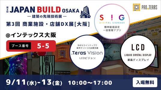 株式会社プロテラスは、2024年9月11日(水)〜2024年9月13日(金)にインテックス大阪で開催される「第8回 JAPAN BUILD OSAKA/第3回 商業施設・店舗DX展」に出展が決定いたしました。
