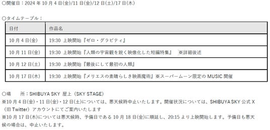 宇宙への想像力を刺激するルーフトップ映画鑑賞。渋谷に拠点を置く、映像アートの発信地イメージフォーラムが主催し、今年で38回目を迎える年に一度の祭典『イメージフォーラム・フェスティバル』との共同企画の特別上映イベント。「空を見上げて、感性をひらく。SHIBUYA SKYの5周年」というアニバーサリーイベントのコンセプトに合わせ、人類がこれまで描いてきた「宇宙」への憧れや想像をさまざまな視点で描いた映画をセレクト。