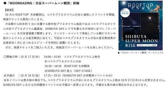 今年最も月が地球に近づく10月17日(木)スーパームーンの夜、「ROOFTOP SUPER MOON NIGHT」と題し、屋上展望空間「SKY STAGE」では多数のイベントを開催いたします。