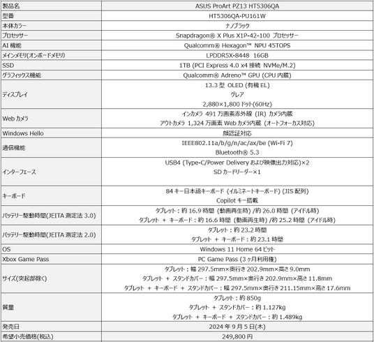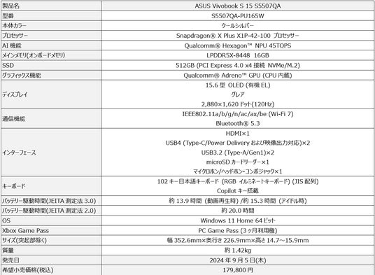 ASUS JAPAN株式会社はCopilot+ PCに対応する新しいCPU「Qualcomm(R) Snapdragon(R) X Plus X1P-42-100 プロセッサー」を搭載した、「ASUS Vivobook S 15 S5507QA」および「ASUS ProArt PZ13 HT5306QA」を発表いたしました。2024年9月5日(木)より販売開始となります。