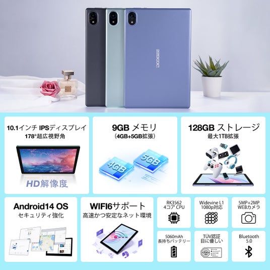 特長:Android14 WIFI6 タブレット RAM 9GB&128GB ROM+最大1TB拡張 8コア 2.0GHz プロセッサー 10.1インチタブレット WIFIモデル Widevine L1対応 TUV認証 デュアルスピーカー 軽量 格安タブレット DOOGEE U10 タブレット本体
