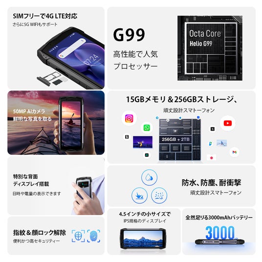 特長:DOOGEE Smini タフネス スマートフォン G99 8コア 頑丈スマホ 4.5インチ SIMフリー 4G LTE 5G WIFI 15GB RAM&ROM 256GB+2TB拡張 Android13スマホ 携帯 50MP AI カメラ 背面ディスプレイ アウトドア 頑丈 防水 防塵 耐衝撃 IP68 IP69K 指紋&顔認識 NFC