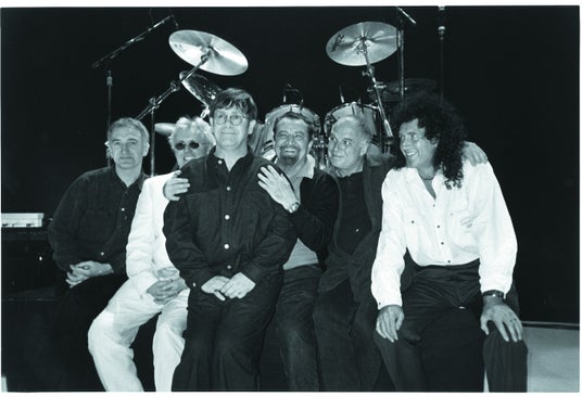 「バレエ・フォー・ライフ」初演(1997)にて、右からブライアン・メイ、一人おいてベジャール、エルトン・ジョン、ロジャー・テイラー、ジョン・ディーコン photo: BBL-Philippe Pache