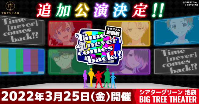 株式会社CRESTが展開するブランド『TRYSTAR(トライスター)』は、2022年3月25日(金)に上演するオリジナル朗読劇<Time [never] comes back!?>(開演:18時45分、会場:BIG TREE THEATER)の会場チケットの先行販売(抽選販売)を3月1日正午より開始しました。あわせて、特典グッズのデザイン、アフタートークの詳細についてもご案内いたします。