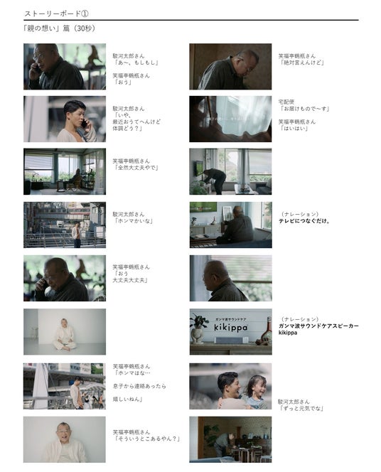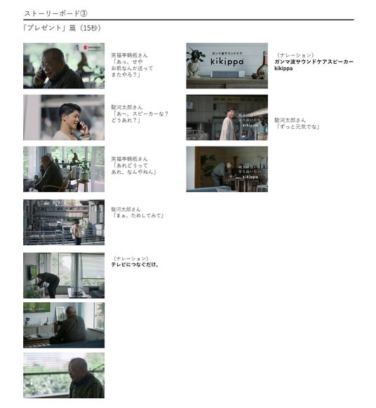 そんな中、息子が送った宅配便が父のもとに届きます。息子から贈られたプレゼントは、テレビスピーカー「kikippa」でした。慣れない表情でリモコンを覗きながら操作すると、テレビから「ガンマ波サウンド」に加工された音声が流れます。粋な気遣いをする息子に父は心の中で感謝し、息子もまた父に感謝の想いを込めて「無理せんときや」と胸の内でつぶやきます。
