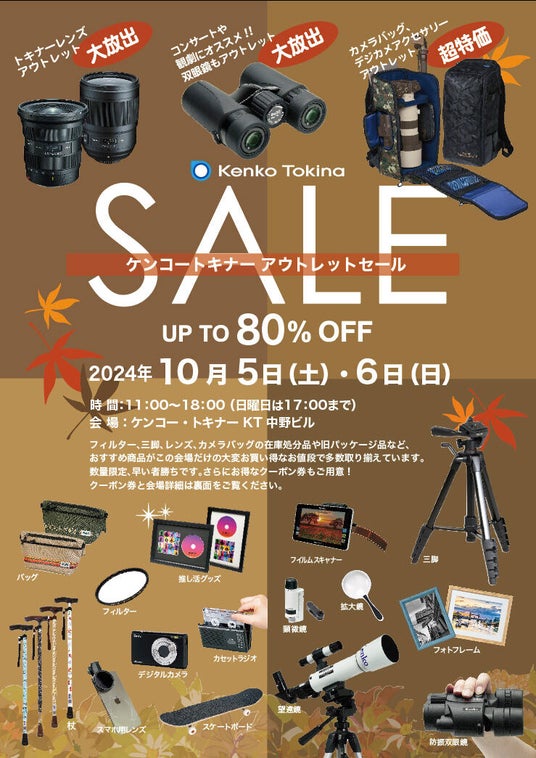株式会社ケンコー・トキナー(本社:東京都中野区 代表取締役社長:山中 徹)は2024年10月5日(土)・6日(日)、ケンコー・トキナー KT中野ビルにてアウトレットセールを開催いたします。