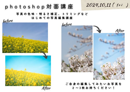 内容 講座で学べる内容: ・Photoshopの基本操作(ツールの使い方など) ・写真の色味を調整する方法や、明るさ ・コントラストの調整 ・傾きの補正やトリミングのやり方