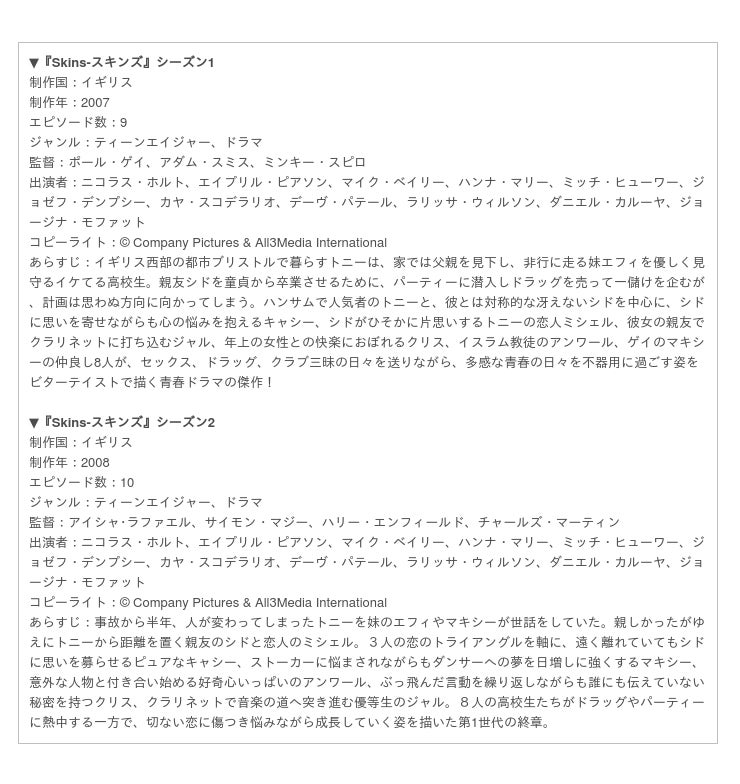 『Skins-スキンズ』はイギリス西部の港湾都市ブリストルを舞台にティーンネイジャーが悩み、葛藤し、傷つきながらも大人へ成長していく過程を描いた青春群像劇で、イギリスでは2007年〜2013年に全7シーズンが放送されました。登場人物たちは2シーズン毎に入れ替わり、シーズン7ではシーズン1〜6で登場する3人の大人になった日々が描かれます。