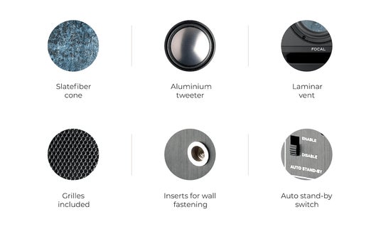 ALPHA EVOシリーズは、ミックス、マスタリング、DJ、ブロードキャストなど、さまざまな用途に対応し、あらゆる環境での優れたモニタリングを提供してくれます。 広い音の分散を確保するアルミニウム製インバーテッド・ドーム・ツイーターと、そのトーンバランスの中立性とダイナミクスで高く評価されているFocal独自のスレートファイバー・コーンを搭載。フランスのサンテティエンヌで生産されており、周波数特性のニュートラルさとダイナミック・レンジにおいて非常に優れています。大型ラミナーベントを備え、ノイズや歪みの大幅な削減を実現。バスレフ設計により、狭いスペースでも安定したモニターを提供してくれます。デザインは、従来のモニターの立方体の形状は丸みを帯びたエッジに変わり、 入力端子はXLR接続に加え、TRS入力、RCA入力(アンバランス)も搭載。さらに自動スタンバイモードのON/OFFスイッチや、壁と天井に固定するためのインサートを備えており、イマーシブ環境の構築などのニーズにも幅広く対応できます。
