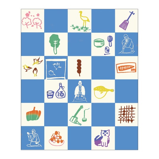 A(画像左):市松模様のなかに、過去10年のネタから選りすぐりの15個をかわいらしいイラストにして落とし込みました。どの演目か想像を膨らませてお楽しみください。