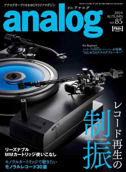 アナログオーディオと人と物にまつわる物語を紹介する、国内唯一のアナログオーディオ専門誌「季刊・アナログ」。最新85号は、レコード再生に大きく影響する“振動ノイズ”にフォーカス、制振の手法と理論をさまざまに実践した特集「レコード再生の制振」をはじめ、リーズナブルなMMカートリッジの使いこなし、モノラルカートリッジで聴きたいモノラルレコード30選など、盛りだくさんの内容でお届けします。ぜひお手に取ってお読みください。