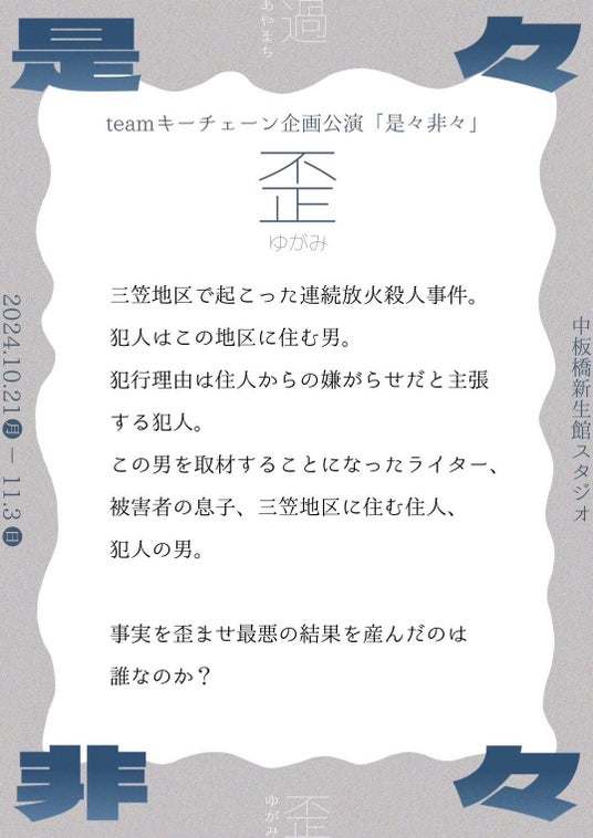 「是々非々」は《過》と《歪》の2本の脚本を、4人芝居4チームで観せる作品です。
