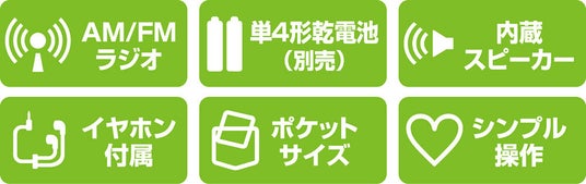 電池持続時間スピーカー使用時:約15時間(目安)イヤホン使用時:約20時間(目安)(条件:AM/FM、単4形アルカリ乾電池使用)