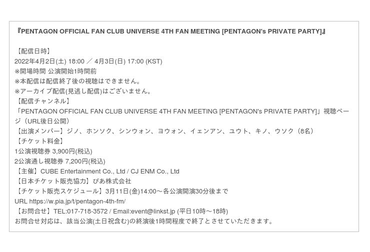 PENTAGON OFFICIAL FAN CLUB UNIVERSE 4TH FAN MEETING [PENTAGON's PRIVATE PARTY] 開催決定
