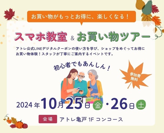 2024年10月25日(金)、26日(土)は「10月のスマホ教室×アトレ亀戸お買い物ツアー」、2024年11月10日(日)は「三世代でお出かけしよう!学べる秋のアトレ亀戸文化祭」を開催!