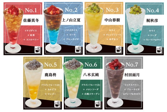 コラボドリンクは、「佐藤真冬」「上ノ山立夏」「中山春樹」「梶秋彦」「鹿島柊」「八木玄純」「村田雨月」をイメージした全7種をご用意します。
