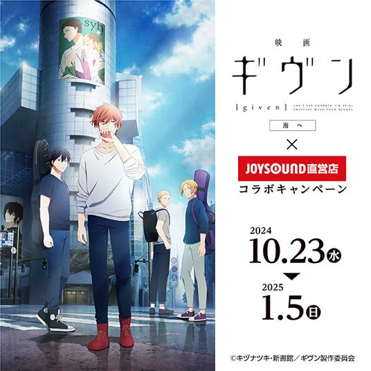 株式会社エクシングの子会社で、全国にカラオケ店舗を展開する株式会社スタンダード(本社:東京都港区、代表取締役社長:米田洋一)は、2024年10月23日(水)から2025年1月5日(日)までの期間中、「『映画 ギヴン 海へ』×JOYSOUND直営店コラボキャンペーン」と題し、JOYSOUND池袋西口公園前店(東京)・JOYSOUND名駅太閤口店(愛知)・JOYSOUNDなんば戎橋店(大阪)の3店舗にカラオケコラボルームをオープン!また、JOYSOUND直営店30店舗にて、オリジナルコースター付きコラボドリンクを展開します。