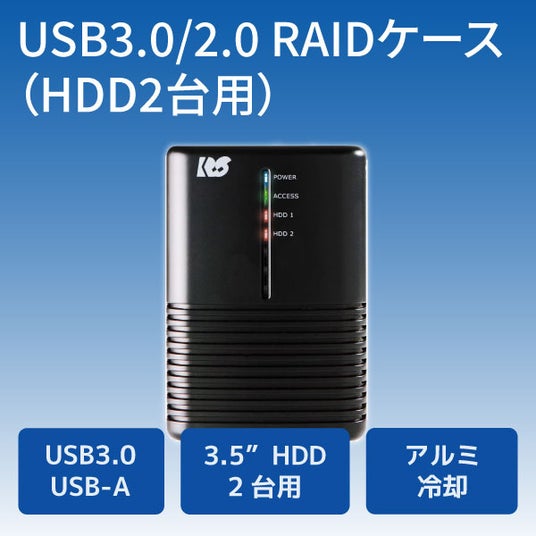3.5インチSATA HDDを2台組み込み可能な、USB接続ハードウェアRAIDケースです。