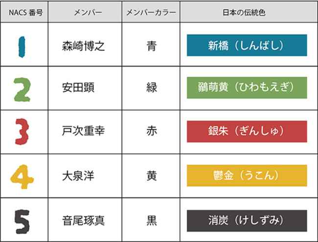 結成25 周年を迎えた演劇ユニットTEAM NACS。メンバーのみなさんの「NACS 番号」と「メンバーカラー」を「SO-SU-U」のデザインに反映させました。「1・森崎博之/青」「2・安田顕/緑」「3・戸次重幸/赤」「4・大泉洋/黄」「5・音尾琢真/黒」を表しています。色はそれぞれ、伝統色に置き換えています。