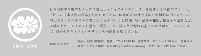 京都のテキスタイルブランド「SOU・SOU」(代表取締役:若林剛之)では、演劇ユニット「TEAM NACS」25 周年記念作品『LOOSER 2022』の配信を記念した、コラボレーショングッズを制作しました。メンバーのみなさんのNACS 番号とそれぞれのメンバーカラーを、SOU・SOU を代表するテキスタイルデザイン「SO-SU-U 柄」に反映させました。コラボレーショングッズは、T シャツ、足袋下(たびした)、クリアファイルセットの3アイテム。TEAM NACSのオフィシャルサイトにて予約受付中です(「SOU・SOU」での取り扱いはありません)。