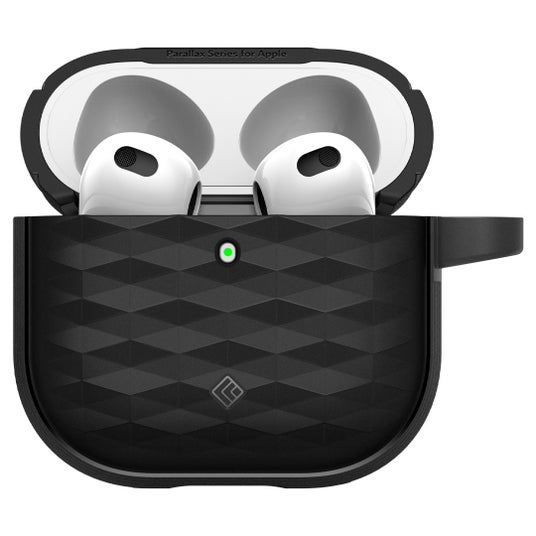 ケースオロジーのシグネチャーモデルである「パララックス」は、立体的なパターンが特徴。光の当たり具合で見た目が変化する楽しさに加え、洗練されたデザインと良い触り心地も魅力です。今回、AirPods 4の発売に合わせて、初めてウェアラブルアクセサリーとして登場しました。