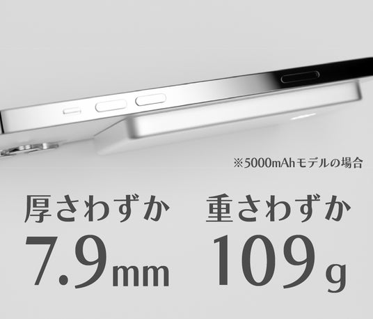 - 超薄型・超軽量設計:厚さ7.9mm、重さ109gというスリムで軽量な設計でありながら、5000mAhのバッテリー容量。また、10000mAhモデルもご用意。