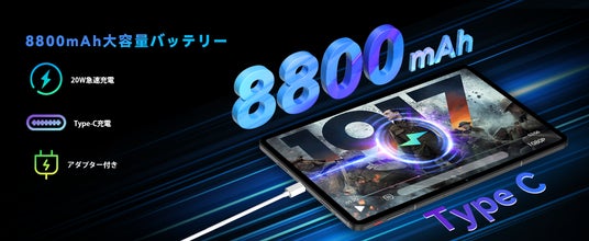 8000mAhの大容量バッテリーを搭載し、長時間の使用が可能です。20Wの急速充電に対応しており、付属の充電器を使えば短時間で充電が完了。バッテリー切れの心配なく、外出先でも安心して使えます。