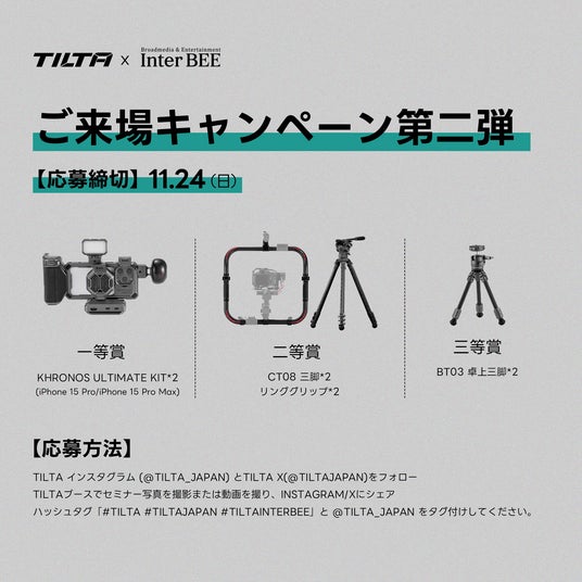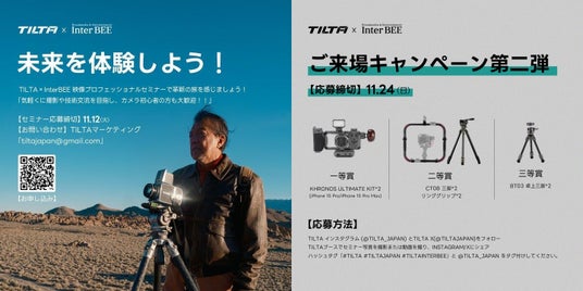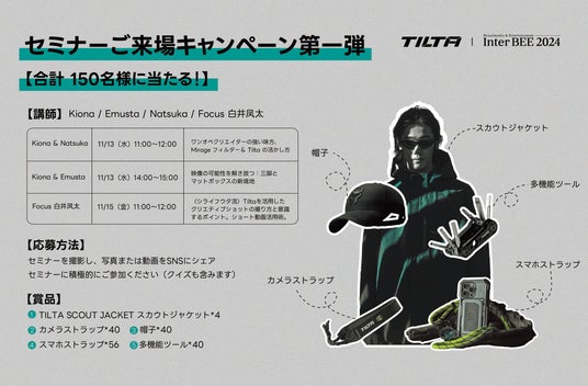 中国・深センで2010年に設立され、カメラアクセサリーや撮影用機材などを提供するメーカーTILTA JAPAN株式会社(本社:Shenzhen Tilta Technology Co. Ltd.、代表取締役CEO:曾文凭)今回は11月13日(水)TILTA×InterBEEプロモーションセミナーにて出展、今回は来場プレゼントキャンペーンやお得なクーポン情報をお届けします。ぜひご検討ください。