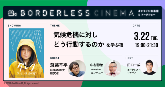 【3/22(火) 19:00-】斎藤幸平氏と見る「グレタ ひとりぼっちの挑戦」オンライン上映|社会問題を知るオンライン映画館×トークショー・ボーダレスシネマ