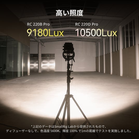ディフューザーなしで、色温度5600K、輝度100%で1mの距離におけるRC 220B Proの照度は9180lux、RC 220D Proの照度は10500luxに達します。