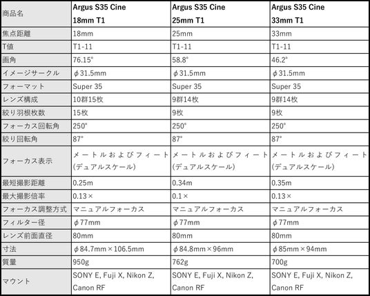 Argus S35 レンズ単品:各195,000円前後/ 3本バンドルセット:各521,000円前後