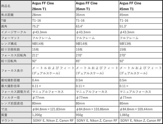 Argus FF レンズ単品:各326,000円前後/ 3本バンドルセット:各858,000円前後