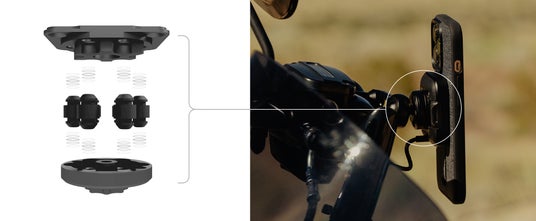 モーターバイク用マウント専用に、独自の振動緩衝機構を開発。緻密に設計された技術により、薄型でかさばらない形状ながらも効果的にスマートフォンの揺れや振動を防止し、エンジンの振動からスマートフォンを保護します。