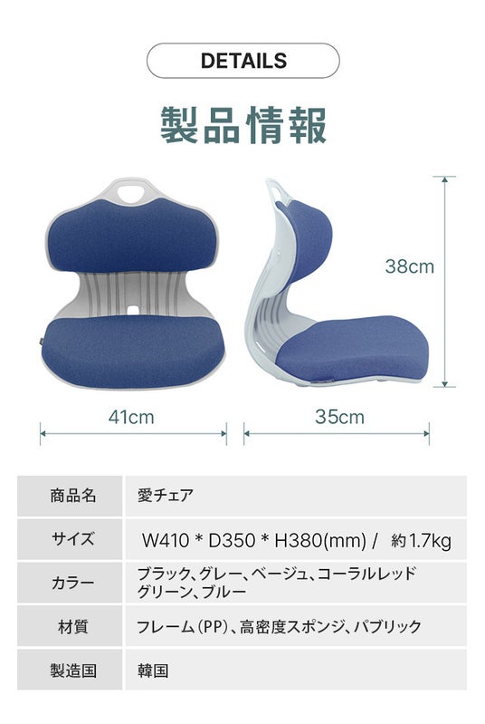 極厚35mmの高密度クッションがお尻と腰を支えて正しい姿勢に導きます。座面が39cmと広いので、大柄な男性や、妊婦さんなどおなかの大きい方も楽に座る座椅子!