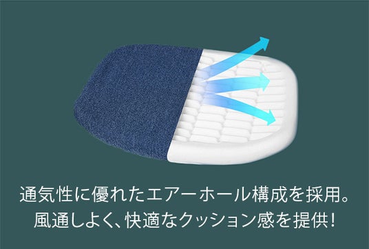 座面にエアホール構成で通気性抜群、一年中快適に快適に座れる。お尻と腰が楽ちん!