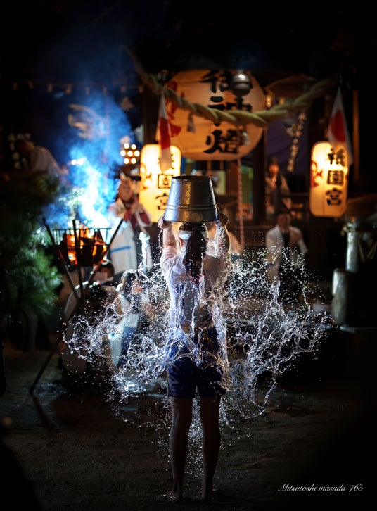 祭りの一幕。水をかぶる女性は水行ではなさそうです。というのも、その手にあるのはアルミのバケツ。水かぶりという火災除けの祈願だそう。気合一閃、豪快に水をかぶるさまは、このあとに起こる「何か」を感じさせます。逆光に照らされた水の瞬間の表情がなんとも美しく、勢いと力強さを感じさせます。透明感を感じる光の条件も良かったようです。被写体が良いだけではありません。その背景もなんともドラマチックです。提灯やしめ縄、松明など、祭りや伝統を感じさせるアイテムがバランスよく配置され、画面の中に見事に収まっています。それらが合わさることによって構図の中に必要な情報がぎゅっと詰め込まれ、1枚の中に祭りのすべての魅力を詰め込むことができました。