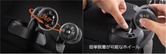 360°回転するキャスターとデュアルホイールにより、安定して荷物を移動できます。ワンプッシュで着脱できるシステムを採用し、取り外しも簡単です。