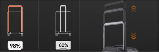 従来のハンドルは中央の凹凸部分がスペースを圧迫することで収納効率が下がりましたが、バッグの形に沿ったハンドル設計により収納スペースの98パーセントを使用できます。ハンドルも3段階伸縮可能なため、身長やシチュエーションに応じて調整可能です。