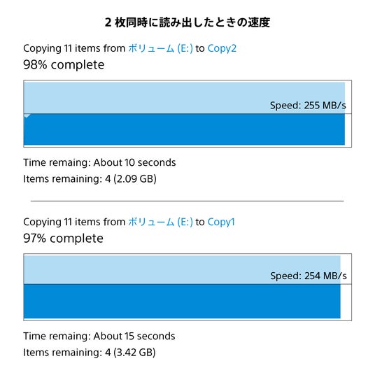 例えば、UHS-IIのSDXCメモリーカードを2枚読み出すとき、メモリーカード1枚から読み出したときとほぼ同等の読み出し速度でデータを読み出すことができ、大量の写真・動画データを2枚のメモリーカードからPCなどにバックアップすることが可能です。非常に効率的なデータ転送が可能なため、外出先や撮影現場など、時間の制約がある環境での使用もおすすめです。