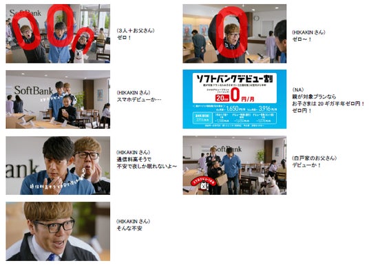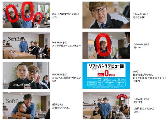 新テレビCMでは、ソフトバンクショップでスマホを欲しそうに眺める息子役の番家さんと、子どものスマホデビューについて心配そうにしている反町さんが登場。その背後からクルー役のHIKAKINさんが「通信料高そうで、不安で夜しか眠れないよ〜」と反町さんの心の声をアフレコします。そんなお父さんを見て息子役の番家さんが「大丈夫?」と心配すると、HIKAKINさんが「そんな不安ゼロ〜!」と大きな0(ゼロ)を腕で作り、お子さまのスマホデビューがおトクな「ソフトバンクデビュー割」を紹介します。HIKAKINさんの表現力溢れる立ち振る舞いや、3人の息のそろった0円ポーズなどコミカルな展開にぜひご注目ください。